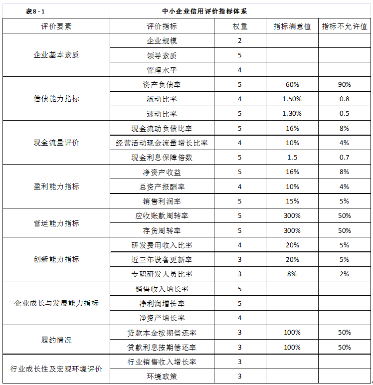 倉儲金融業(yè)務(wù)中,中小企業(yè)篩選的標(biāo)準(zhǔn)要根據(jù)國家對于中小型企業(yè)發(fā)展的指導(dǎo)思想,即“選擇重點,規(guī)范操作,總結(jié)經(jīng)驗,翁不推進”與“支持發(fā)展與防范風(fēng)險相結(jié)合;政府扶持與市場操作相結(jié)合;開展擔(dān)保與提高信用相結(jié)合”的三個原則要求,結(jié)合企業(yè)的實際情況對中小型企業(yè)進行篩選。倉儲金融業(yè)務(wù)是一項新業(yè)務(wù),為有效規(guī)避風(fēng)險,銀行對企業(yè)的審查相對嚴(yán)格,獲得批準(zhǔn)者一般都是各項業(yè)務(wù)素質(zhì)比較優(yōu)良的企業(yè)。比如廣東發(fā)展銀行在審貨時,一般選取行業(yè)市場占有率位于前三位的企業(yè),而且產(chǎn)品暢銷、價格穩(wěn)定、流通性好,同時也考慮企業(yè)的財務(wù)狀況、實力、品牌知名度等,目的是控制好信貸風(fēng)險。與傳統(tǒng)信貸業(yè)務(wù)的審查不同,倉儲金融業(yè)務(wù)對所服務(wù)的周末和小型企業(yè)的審核更強調(diào)企業(yè)的成長性,這涉及該企業(yè)的還款來源。此外,經(jīng)營管理團隊、產(chǎn)品及其技術(shù)含量、市場等也是審查的重點。對中小型企業(yè)的信用評價指標(biāo)體系如表8-1所示,評價的要素包括企業(yè)基本要素、賠償能力指標(biāo)、現(xiàn)金流量評價、盈利能力指標(biāo)、營運能力指標(biāo)、創(chuàng)新能力指標(biāo)、企業(yè)成長與發(fā)展能力指標(biāo)、履約情況、行業(yè)成長性與宏觀環(huán)境評價。